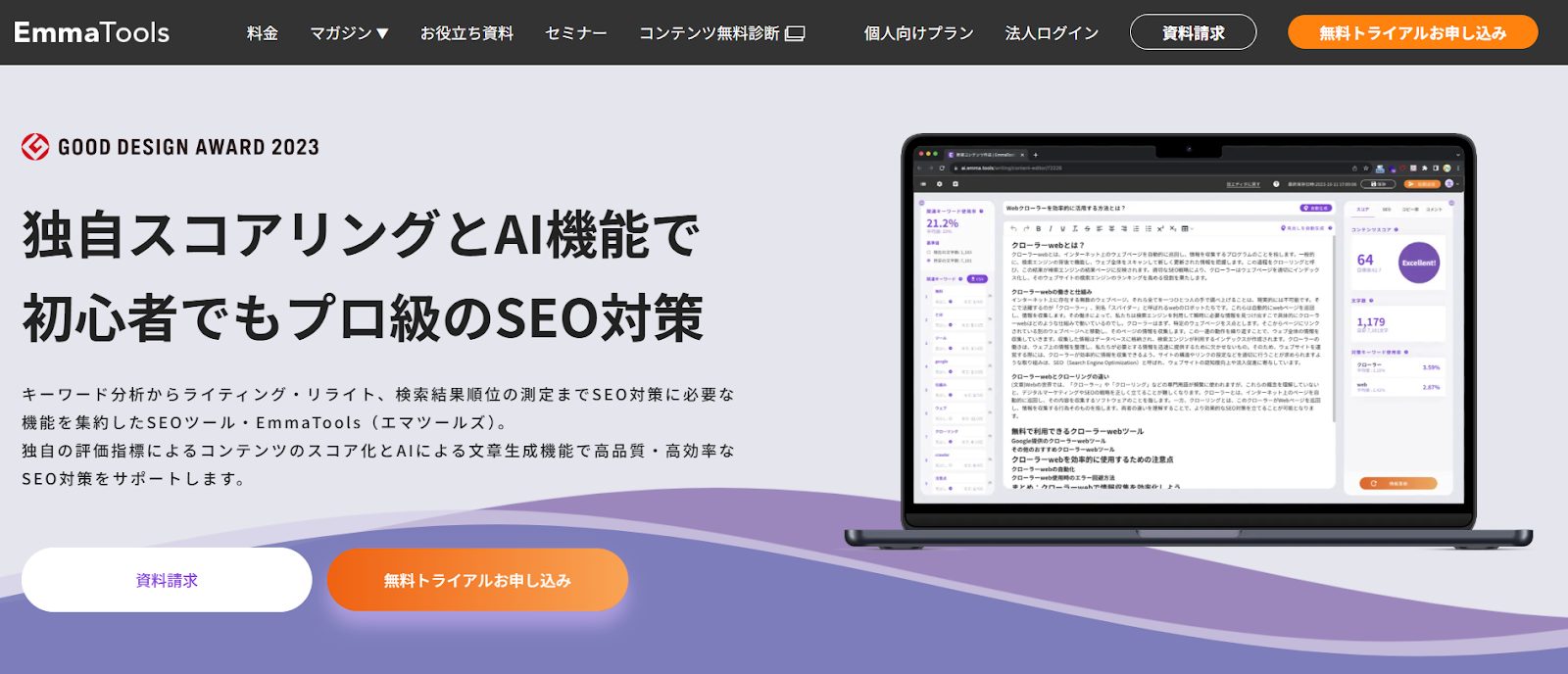 AIがユーザーの検索意図を深く分析し、コンテンツを改善するための具体的なヒントを提供してくれるツールです。SEOやコンテンツマーケティングのツールとして、国内トップクラスの実績を持っています。