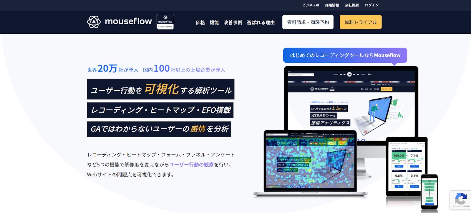 Mouseflowはヒートマップに加え、セッション録画・フォーム分析など豊富な機能を備えた、デンマーク発のツールです。日本語対応も進んでおり、無料プランでは月間500セッションまで計測可能。