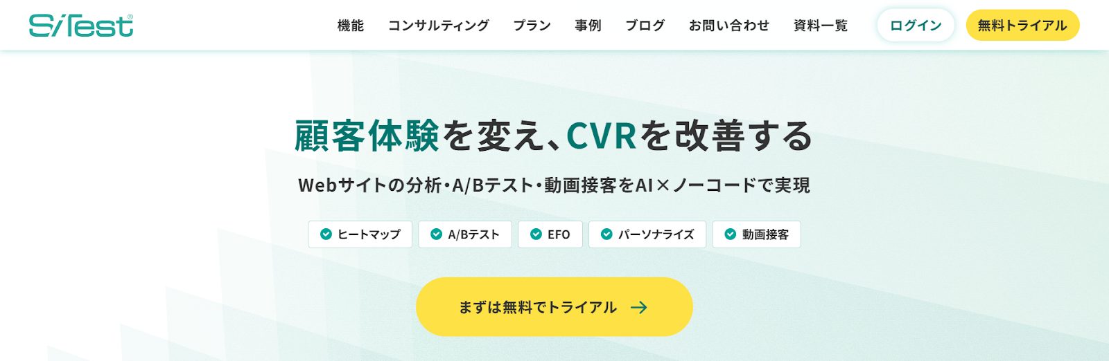 SiTestは、解析から改善・テストまでを一元管理できるオールインワンツールです。ヒートマップ分析に加え、ABテストやEFO(入力フォーム最適化)、ポップアップ表示など、Webサイト改善に必要な機能を網羅しています。