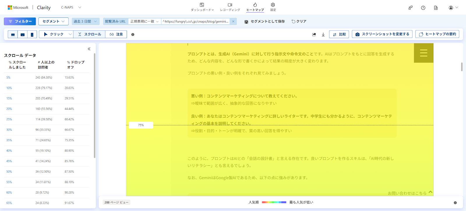 次に、ヒートマップを使って仮説を検証します。クリックヒートマップでは、クリックしてほしいCTAボタンや重要なリンクが「赤く」表示されているかを確認しましょう。もしクリックされていない場合は、デザインが目立っていない、またはその直前の説明で十分に説得できていない可能性があります。