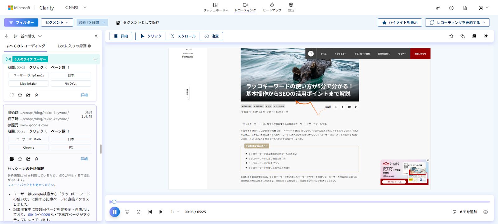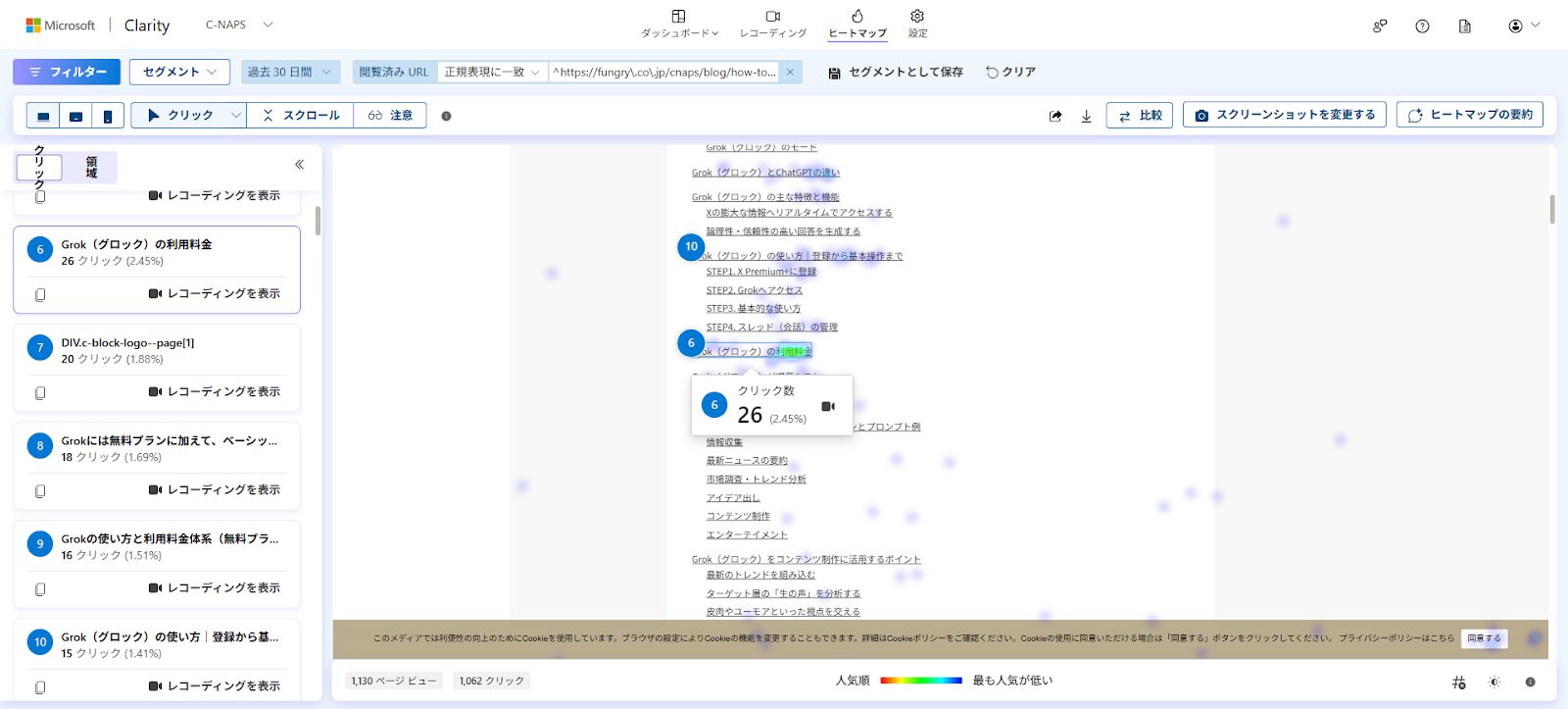 ここでは、ヒートマップツール「Microsoft Clarity(マイクロソフトクラリティ)」の実際の機能と照らし合わせて紹介します。