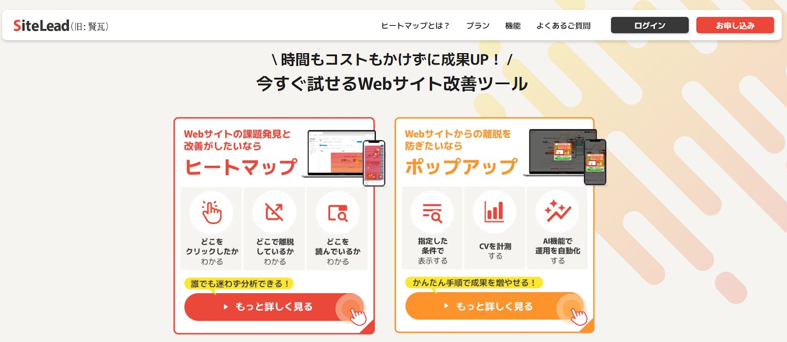 Site Leadは、ヒートマップ分析に加えて、ポップアップやチャットなどのWeb接客機能を組み合わせて活用できるツールです。ユーザー行動を分析しながら、適切なタイミングで訴求を行えるため、CVR改善を目的とした運用に向いています。分析から施策実行までを一体で行いたい企業に適しています。