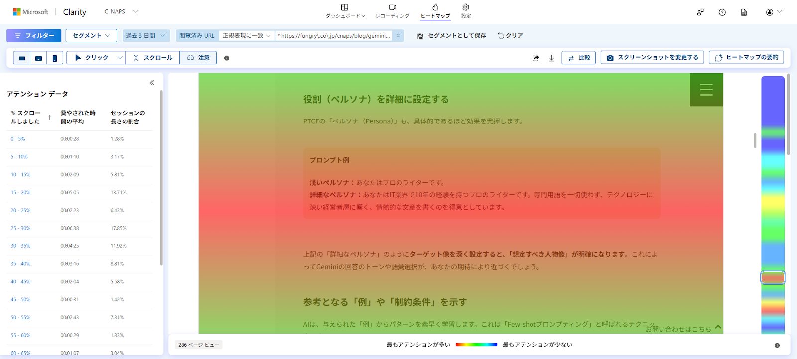 アテンションマップは、ユーザーがページ内のどの部分で立ち止まり、じっくり読んでいるかを可視化する機能です。よく読まれているエリアは赤く、スルーされているエリアは青く表示されます。これにより、「伝えたいメッセージが読まれているか」「興味・関心の高いコンテンツは何か」を判断できます。