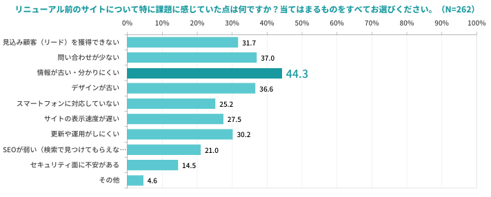 リニューアル前の最大の課題として挙げられたのが、「情報が古い・分かりにくい(44.3%)」でした。次いで「問い合わせが少ない(37.0%)」、「デザインが古い(36.6%)」「見込み顧客(リード)を獲得できない(31.7%)」が主な動機となっています。