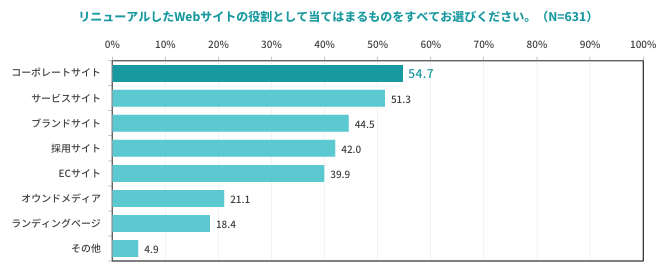 リニューアルしたホームページの役割として、コーポレートサイト(54.7%)やサービスサイト(51.3%)のみならず、ブランドサイト(44.5%)や採用サイト(42.0%)も高い割合を占めています。