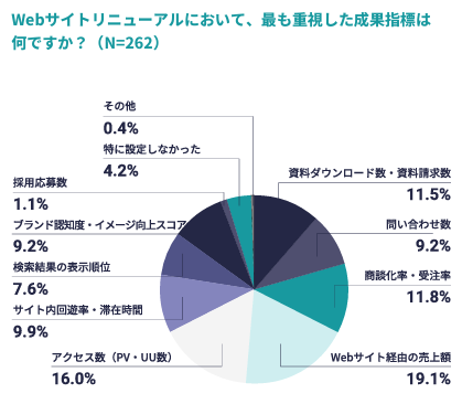 リニューアルにおいてもっとも重視される成果指標は「Webサイト経由の売上額(19.1%)」であり、事業成果に直結する投資として強く意識されています。
