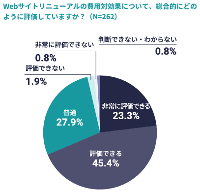 ホームページのリニューアルは、「失敗するリスクが低く、一定のリターンを期待できる事業投資」としての側面を持っています。費用対効果を「評価できる」とポジティブに捉えている企業は全体の68.7%に達しており、かけたコストに見合う、あるいはそれ以上のビジネス価値を実感している企業が多数を占めています。