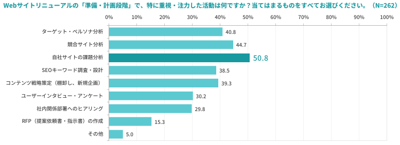 実際に、多くの企業が準備段階でもっとも注力しているのは「自社サイトの課題分析(50.8%)」でした。