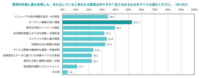 「Webサイトリニューアルに関する実態調査」において、プロジェクトの予算規模や担当者の役職にかかわらず、費用対効果にもっとも影響する要因として最多の回答を集めたのが、「ターゲット顧客の深い理解(52.7%)」でした。