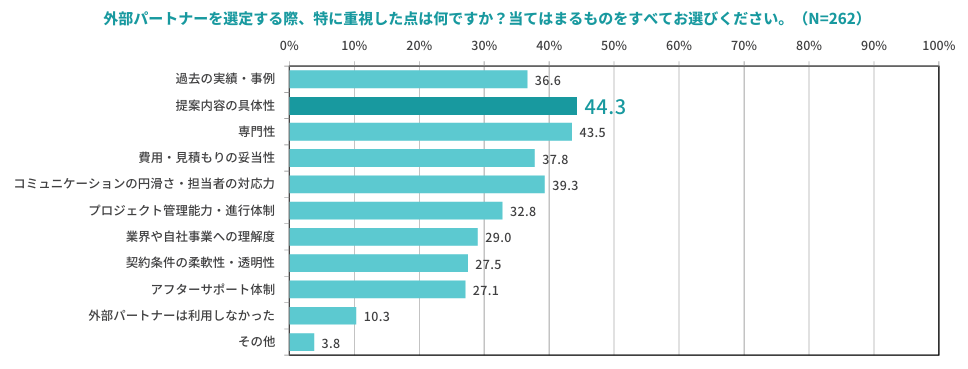 調査によると、制作会社の選定時に重視したポイントとして、その会社の「提案内容の具体性(44.3%)」と「専門性(43.5%)」が上位を占めていました。