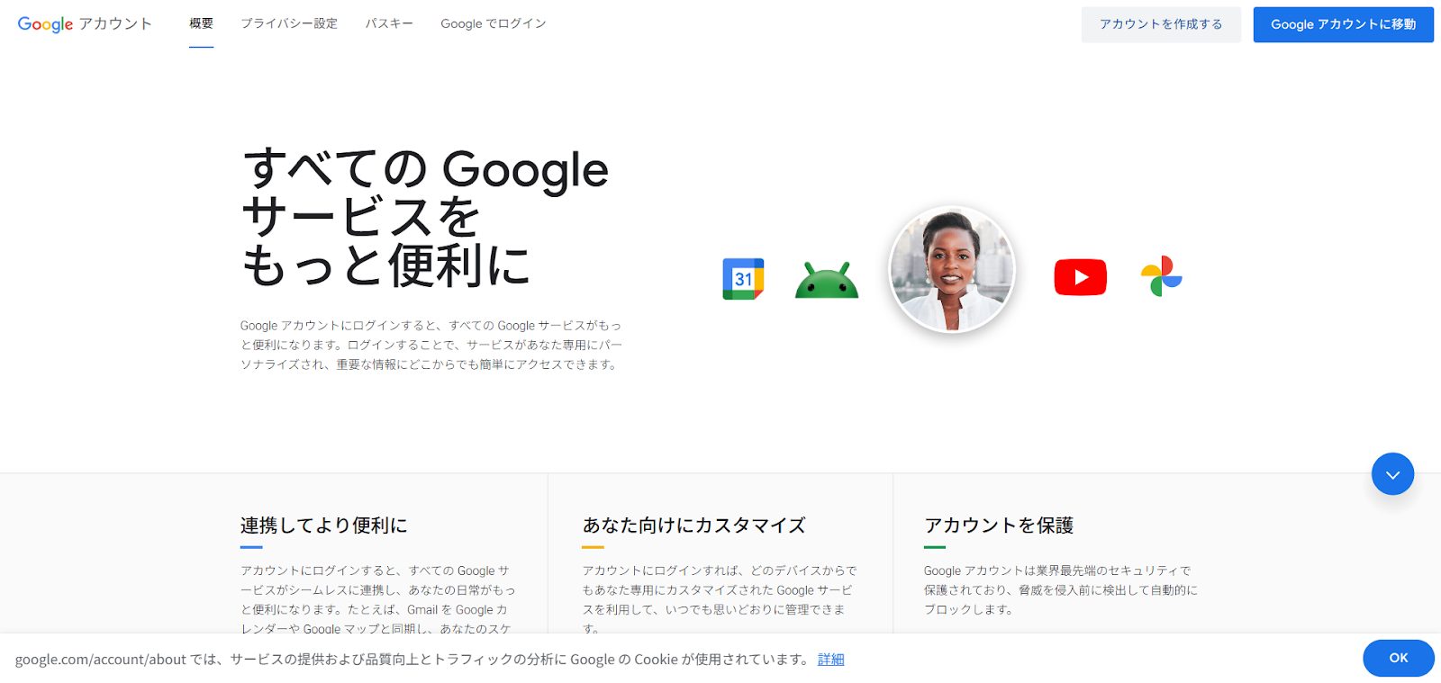 まずは、Google公式サイトにアクセスして、右上の「アカウントを作成」ボタンをクリックしてください。