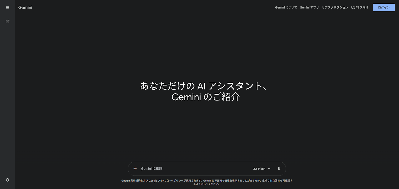 WebブラウザでGeminiの公式サイトへアクセスします。Googleアカウントでログインすれば、すぐにチャット画面が表示されます。