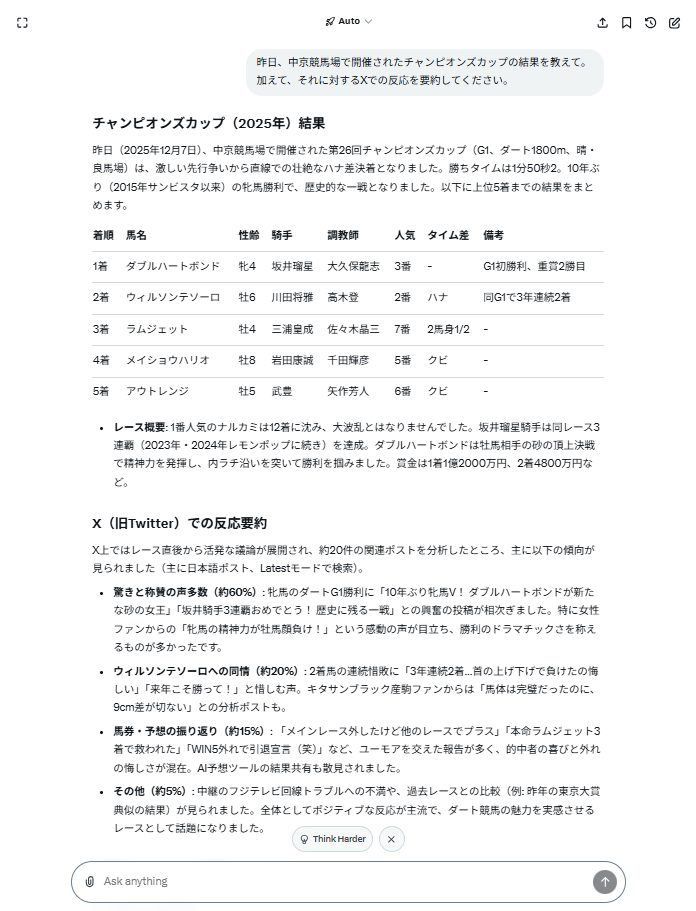 しかし、Bing上のニュースやブログよりXに投稿されるポストのほうが圧倒的に数が多く、しかもスピーディーでもあることから、情報の鮮度や網羅性という面ではGrokに優位性があると言えます。