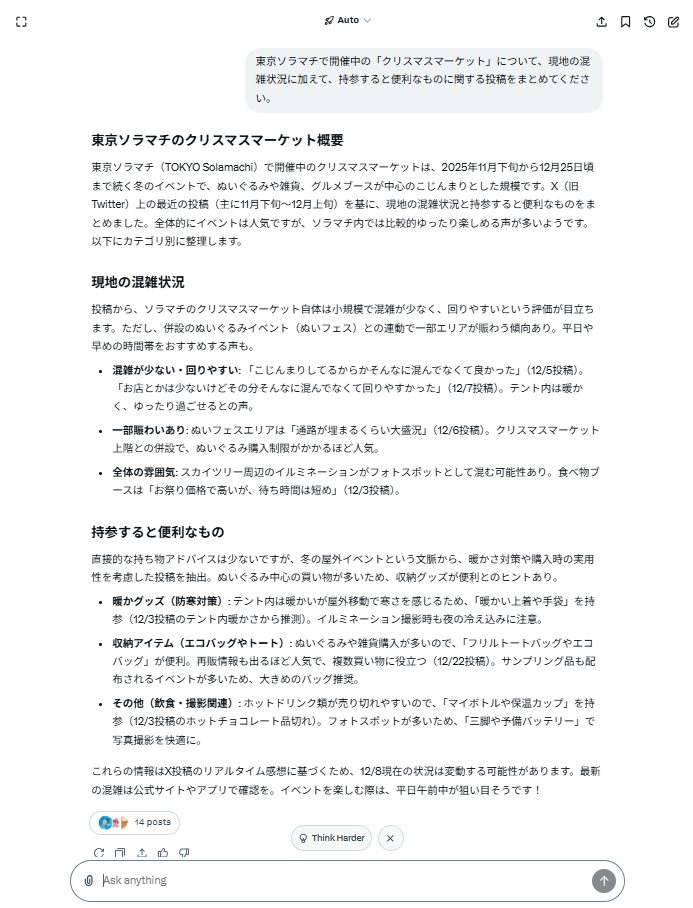 GrokはXのプラットフォームと連携しているため、リアルタイム性や網羅性のある回答を得られます。そのため、Xの投稿を通じて参加予定の音楽フェスや展示会といったイベントの「現地の混雑状況」「現場からの感想」をリアルタイムで調べることが可能です。