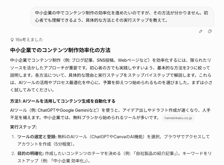 「Think」は、ユーザーからの質問に対して回答だけでなく、そこに至るまでの思考プロセスも示してもらえる機能です。これによって、回答の論理性や信頼性を理解しやすくなるでしょう。