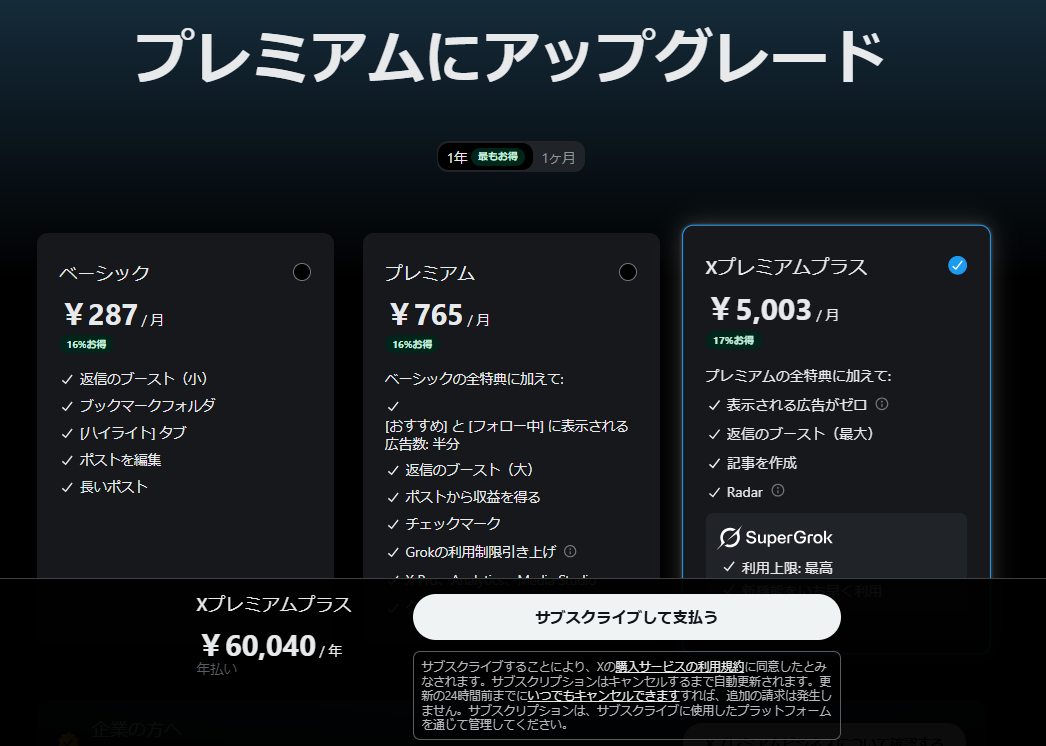 それぞれの月額、年額の利用料金については以下の通りです(XのWebサイトから加入した場合の料金)。