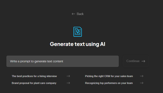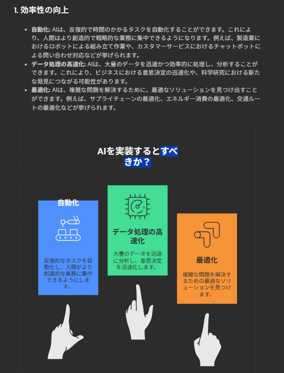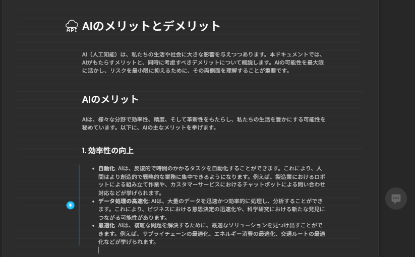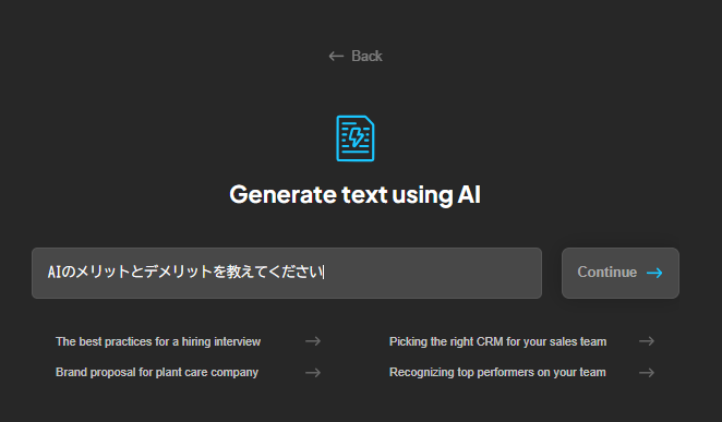 「By generating text using AI」を選択し、例えば「AIのメリットとデメリットを教えてください」と入力します。