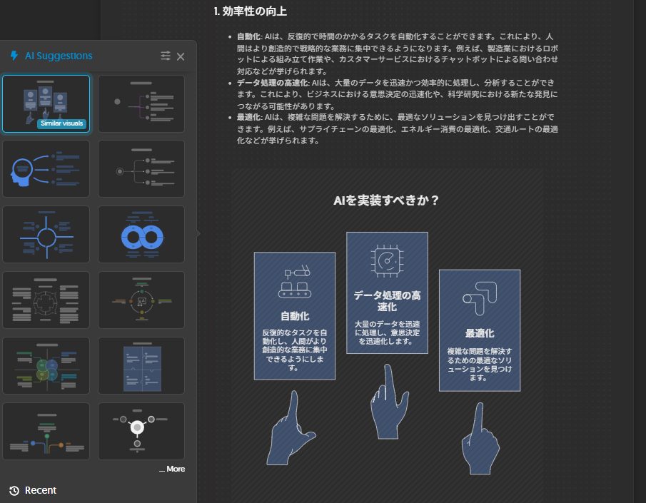 フローチャートやダイアグラム、インフォグラフィックなどを作れるため、プレゼン資料やレポート、ブログ記事などの作成を劇的に効率化できます。