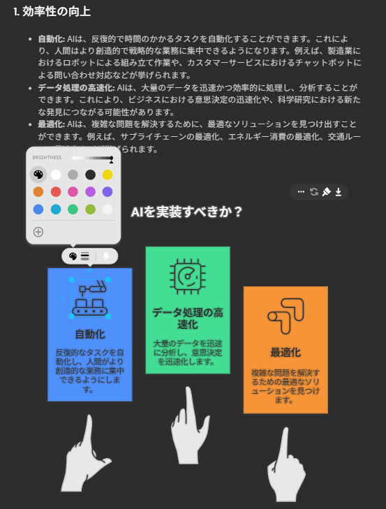 Napkin AIからの回答の中で図解を生成したい項目にカーソルを合わせ、右側の青い「カミナリマーク」をクリックすれば、数種類の中から自身の希望する図解やそのカラーを選べます。