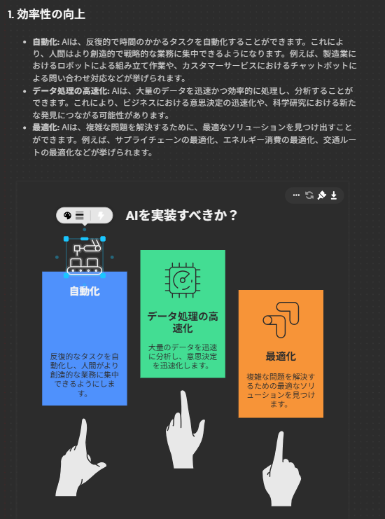このファクトチェックの作業は、Napkin AIに限らずあらゆる生成AIの活用において不可欠です。なぜなら、生成AIはユーザーが入力したテキストの構造化を得意とする反面、その際に事実確認をしているわけではないからです。