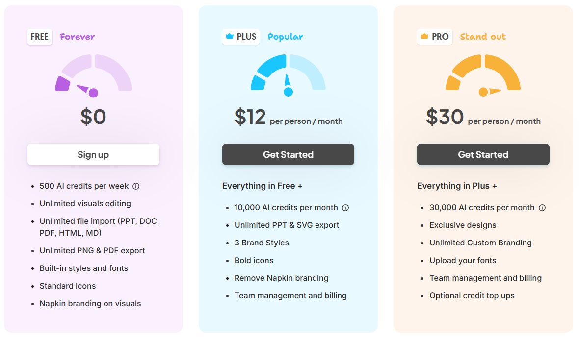 Napkin AIの3つのプランの料金、付与クレジット、特徴を以下の表組にまとめました。