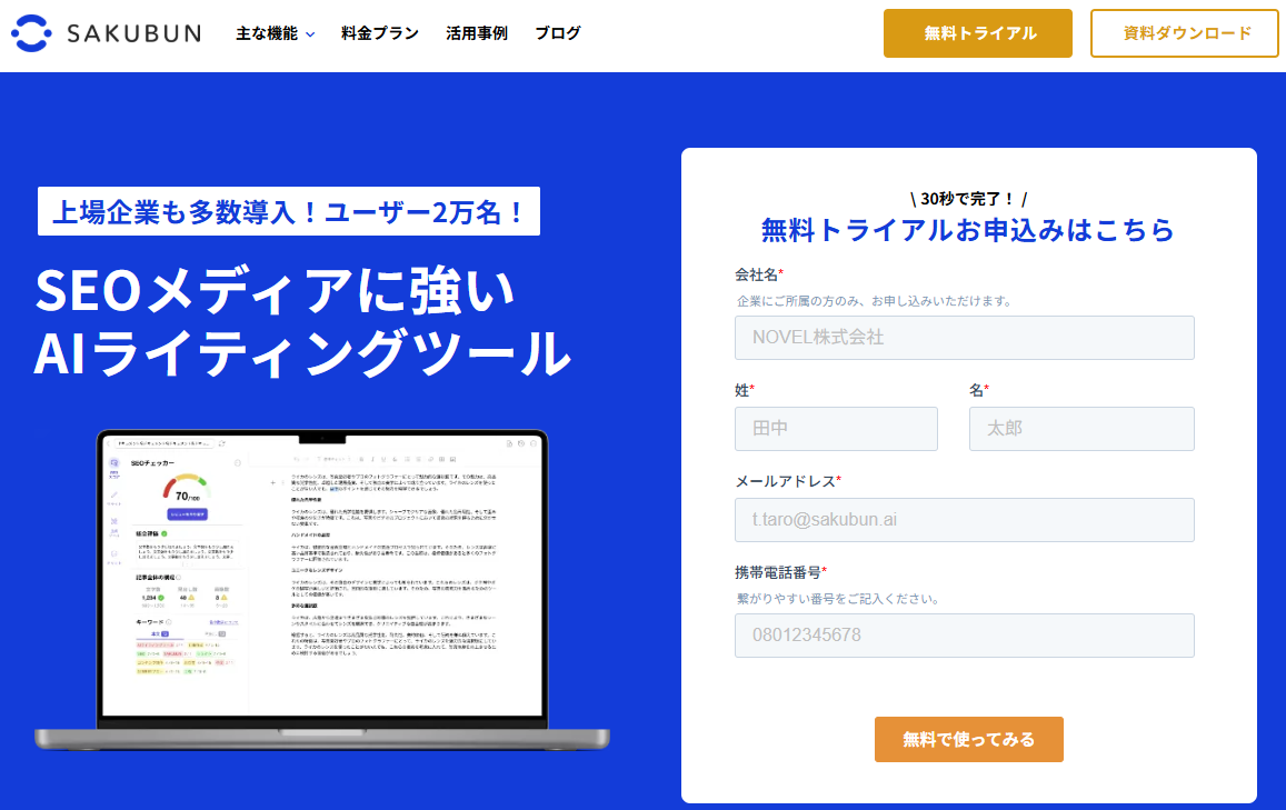 NOVEL株式会社が提供するAIライティングツールです。ブログ記事やメルマガ、広告など用途に合わせたテンプレートが100種類以上用意されているのが特徴。