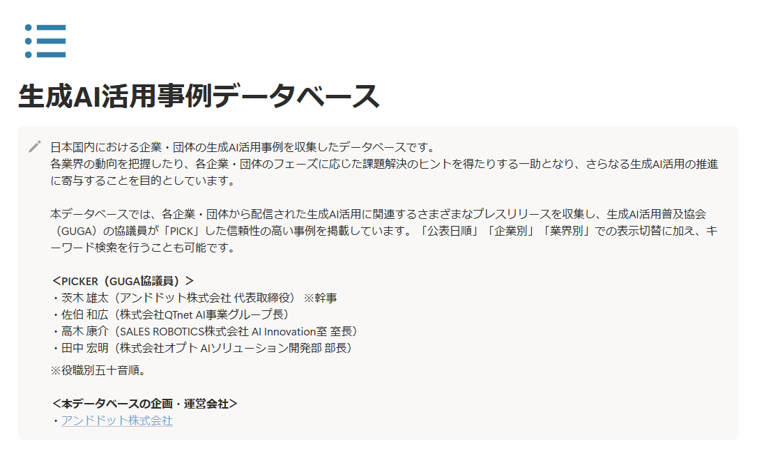 ここで紹介した活用事例以外にも、「どういった業種・企業がAIを活用しているのかをもっと詳しく知りたい」場合には、人生成AI活用普及協会(GUGA)が公開する「生成AI活用事例データベース」を参考にしてください。
