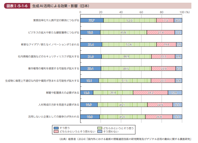 出典:総務省「地方自治体におけるAI・RPA活用促進(令和7年6月30日版)」生成AIの活用による影響については、約75%の企業が「業務効率化や人員不足の解消 につながると思う」と回答しています。