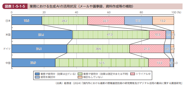 しかし、実際の活用状況を見ると、アメリカ(84.7%)に比べて日本(46.8%)の割合はまだまだ低いことがわかりました。セキュリティリスクなどの懸念点から、導入に慎重な企業が多いことが伺えます。