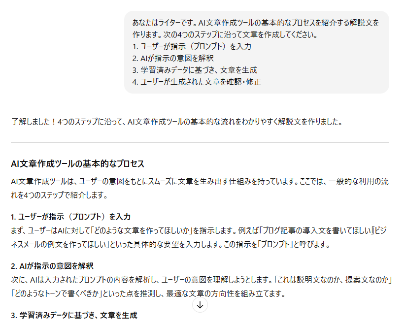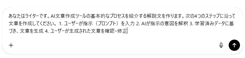 まず、ユーザーは「どのような文章を作ってほしいか」を生成AIツールに指示します。例えば「ブログ記事の導入文を書いてほしい」「ビジネスメールの例文を作ってほしい」といった具体的な要望を入力します。この指示を「プロンプト」と呼びます。