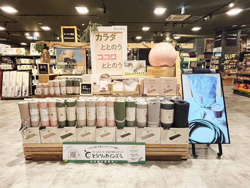 数ある中の一例ですが、カインズのコンセプトショップ「Style Factory ららぽーと海老名店」には、『となりのカインズさん』と連動したフィットネスグッズの特設コーナーが設置されました。店頭に並んだのは、すべて記事で紹介した商品です。