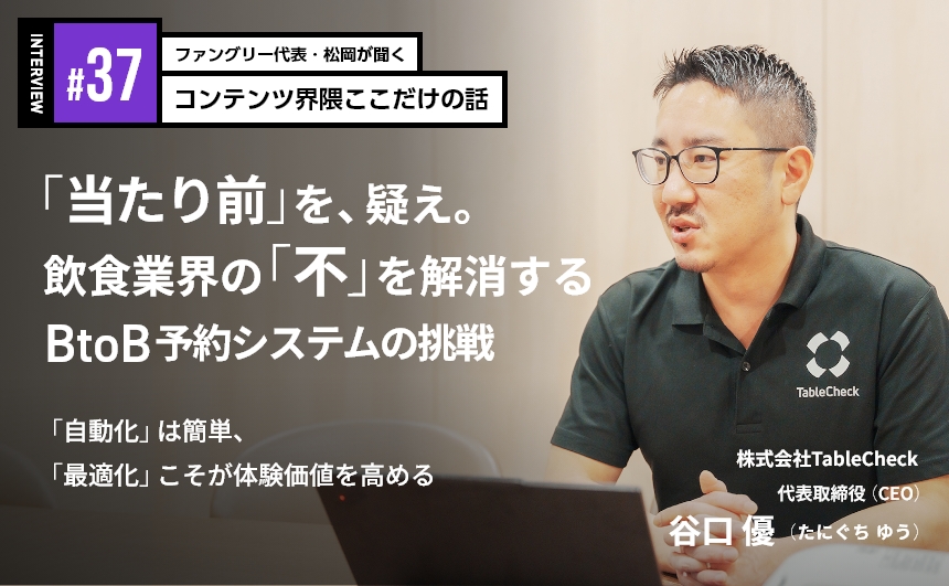 「コンテンツ界隈ここだけの話」第37話のゲストは、国内ミシュラン掲載店の約6割が使用し、国内外で導入店舗が1万3,000店を超えるなど高いシェアを獲得しているBtoB予約システム「TableCheck(テーブルチェック)」を開発・運用する株式会社TableCheckの代表・谷口優さんです。