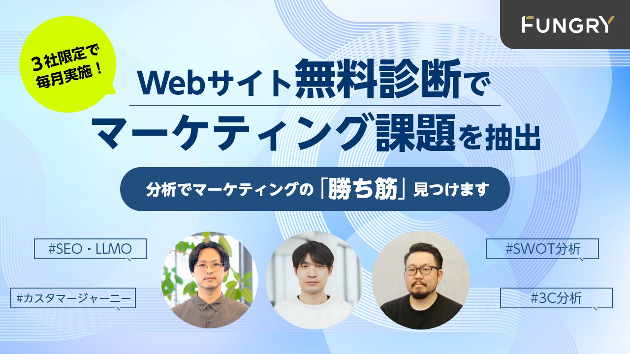 「C-NAPS」を運営するファングリーでは、マーケティングプランナーが3Cクロス分析やSWOT分析などを通して、現在運用しているWebサイトの課題やポテンシャルを無料で診断しています。LLMOやAIOのアプローチも欠かせないこの時代、マーケティングの「勝ち筋」を模索している企業様は、お気軽にお申し込みください。